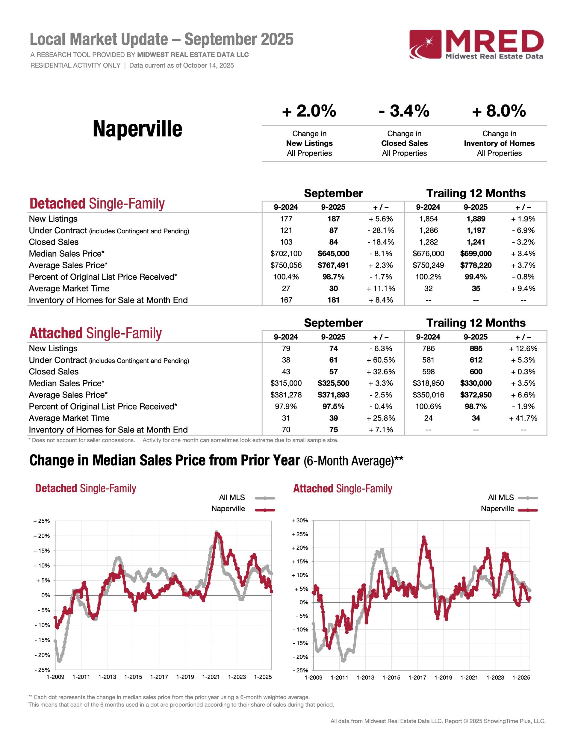 Naperville’s market tells a mixed story this fall — detached single-family homes have slowed, while attached homes (condos and townhomes) continue to shine.